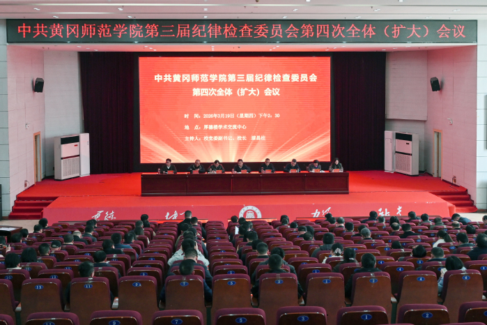 3月19日下午,中共黄冈师范学院第三届纪律检查委员会第四次全体(扩大)会议在厚德楼学术交流中心召开。会议学习贯彻习近平总书记关于党的建设的重要思想、关于党的自我革命的重要思想,认真贯彻党的二十大和二十届历次全会精神,全面贯彻二十届中央纪委五次全会、省纪委十二届五次全会、黄冈市纪委六届六次全会精神,专题部署学校2026年全面从严治党和党风廉政建设工作。校党委书记陈向军等全体在家校领导出席会议。校党委副书记、校长漆昌柱主持会议。